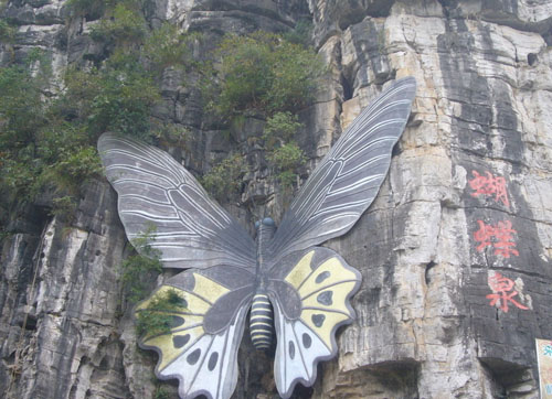 從下關(guān)乘車(chē),沿滇藏公路北行30余公里,車(chē)左側(cè)即有一座古色古色的石牌坊映入眼簾。牌坊上書(shū)"蝴蝶泉"三個(gè)大字,乃郭沫若游大理時(shí)留下的墨跡。 從牌坊到蝴蝶泉邊,約有百米,泉池二三丈見(jiàn)方,四周用透亮的大理石砌成擴(kuò)欄。泉水清澈見(jiàn)底,一串串銀色水泡,自沙石中徐徐涌出,汩汩冒出水面,泛起片片水花。這泉水得蒼山化雪之功,不僅水量穩(wěn)定,水質(zhì)也十分優(yōu)良。 自古以來(lái),有不少文人學(xué)士,到此考察游覽,并寫(xiě)下了許多重要的詩(shī)文。 明代有名的地理學(xué)家徐霞客,曾在游記中熱情稱(chēng)頌蝴蝶泉,他寫(xiě)道:"泉上大樹(shù),當(dāng)四月初,即發(fā)花如蛺蝶,須翅栩然,與生蝶無(wú)異。又有真蝶千萬(wàn),連須鉤足,自樹(shù)巔倒懸而下,及于泉面,繽紛絡(luò)繹,五色煥然。游人俱以此月群而觀之,過(guò)五月乃已。"清代詩(shī)人沙琛,在《上關(guān)蝴蝶泉》詩(shī)中贊道:"迷離蝶樹(shù)千蝴蝶,銜尾如纓拂翠湉。不到蝶泉誰(shuí)肯信,幢影幡蓋蝶莊嚴(yán)。" 每年農(nóng)歷四月至五月間,云弄峰山上各種奇花異草競(jìng)相開(kāi)放,泉邊的合歡樹(shù)散發(fā)出一種淡雅的清香,誘使成千上萬(wàn)的蝴蝶前來(lái)聚會(huì)。這些蝴蝶大的如掌,小的如蜂,它們或翩舞于色彩斑斕的山茶、杜鵑等花草間,或嬉戲于花枝招展的游人頭頂。更有那數(shù)不清的彩蝶,從合歡樹(shù)上,一只只倒掛焉,連須鉤足,結(jié)成長(zhǎng)串,一直垂到水面,陽(yáng)光之下,五彩煥然,壯觀奇麗。尤其是舊歷四月十五這一天,若遇天氣晴和,更是盛況空前,不僅蝴蝶多得驚人,而且品種繁多,如鳳尾蝶、大瓦灰蝶等等,應(yīng)有盡有,匯成了蝴蝶的世界。 蝴蝶泉位于蒼山第一峰云弄峰神摩山下,南距大理古城27公里。蝴蝶泉面積50多平方米,為方形泉潭。泉水清澈如鏡,有泉底冒出,泉邊弄蔭如蓋,一高大古樹(shù),橫臥泉上,這就是"蝴蝶樹(shù)"。每年春夏天之交,特別是4月15日,蝴蝶樹(shù)芬芳引蝴蝶。大批蝴蝶聚于泉邊,滿(mǎn)天飛舞。最奇的是萬(wàn)千彩蝴蝶,交尾相隨,倒掛蝴蝶樹(shù)上,形成無(wú)數(shù)串,垂及水面,蔚為壯觀。蝴蝶泉奇景古已有之,明代徐霞客筆下已有生動(dòng)的記載。郭沫若1961年游覽時(shí),手書(shū)"蝴蝶泉"三個(gè)大字,刻于泉邊的坊石之上。 近年來(lái),蝴蝶泉公園經(jīng)過(guò)修整與擴(kuò)建,修有蝴蝶樓、六角亭、大月牙池、蝴蝶標(biāo)本館、望海樓和徐霞客雕像等。上篇: