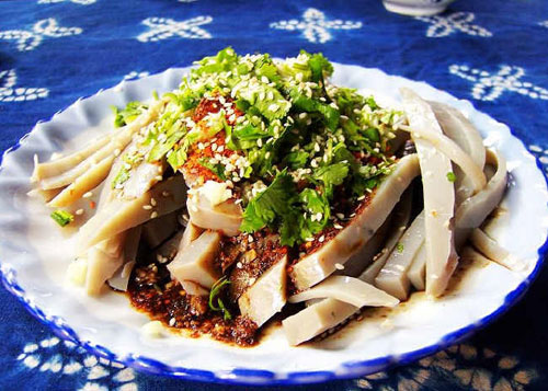 在乾隆《麗江府志》中,曾把這種風(fēng)味小吃稱作“食黑豆腐”。 幾百年來,雞豆涼粉這種風(fēng)味小吃在麗江經(jīng)久不衰,暑吃涼,寒吃熱,涼吃拌以酸醋醬油調(diào)料之類,能消暑開胃、止車暈浪;熱吃將涼粉在平底鍋內(nèi)用香油雙面炸黃、佐以調(diào)料,雖然其貌不揚(yáng),但味道質(zhì)地卻極其細(xì)膩爽滑、適口,是下飯佐酒的一道風(fēng)味好菜。上篇: